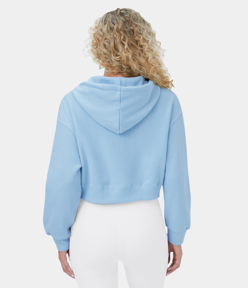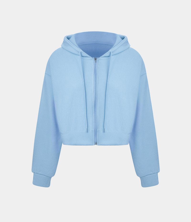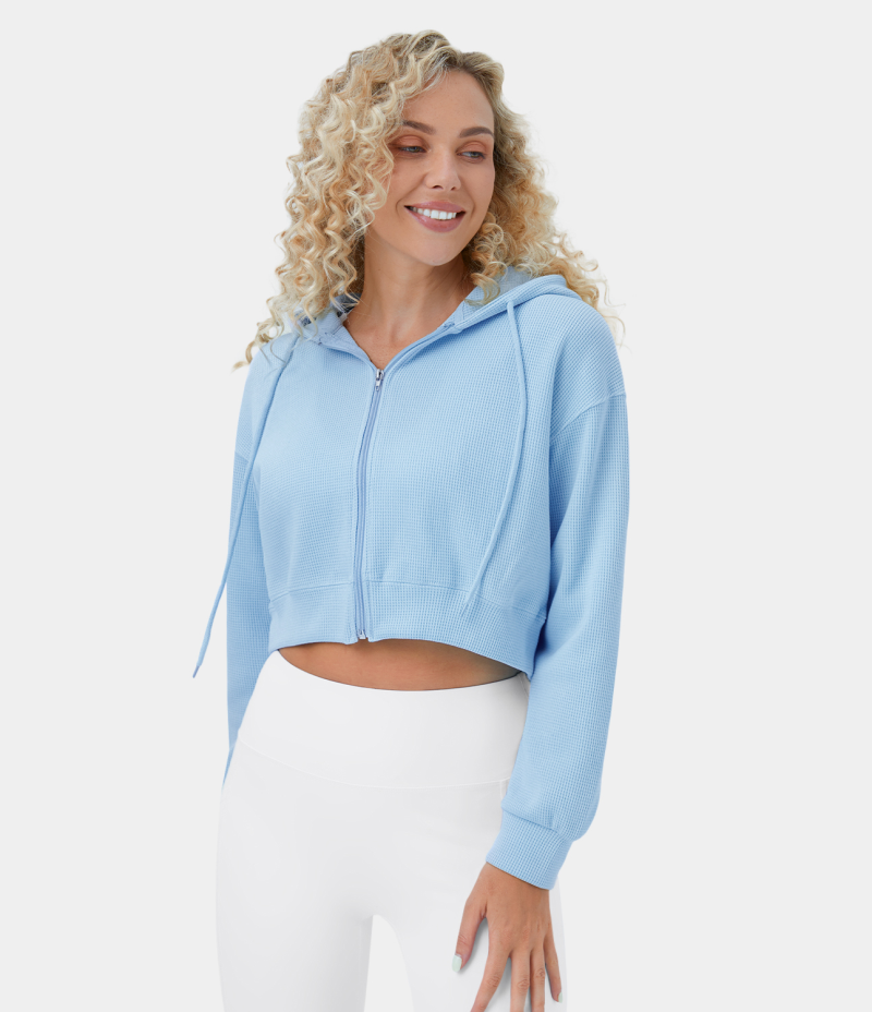 :: Halara Waffle Hooded Drawstring Zipper Cropped Casual Sports Sweatshirt Women's Tops Clear Sky | JXCWLDO-20