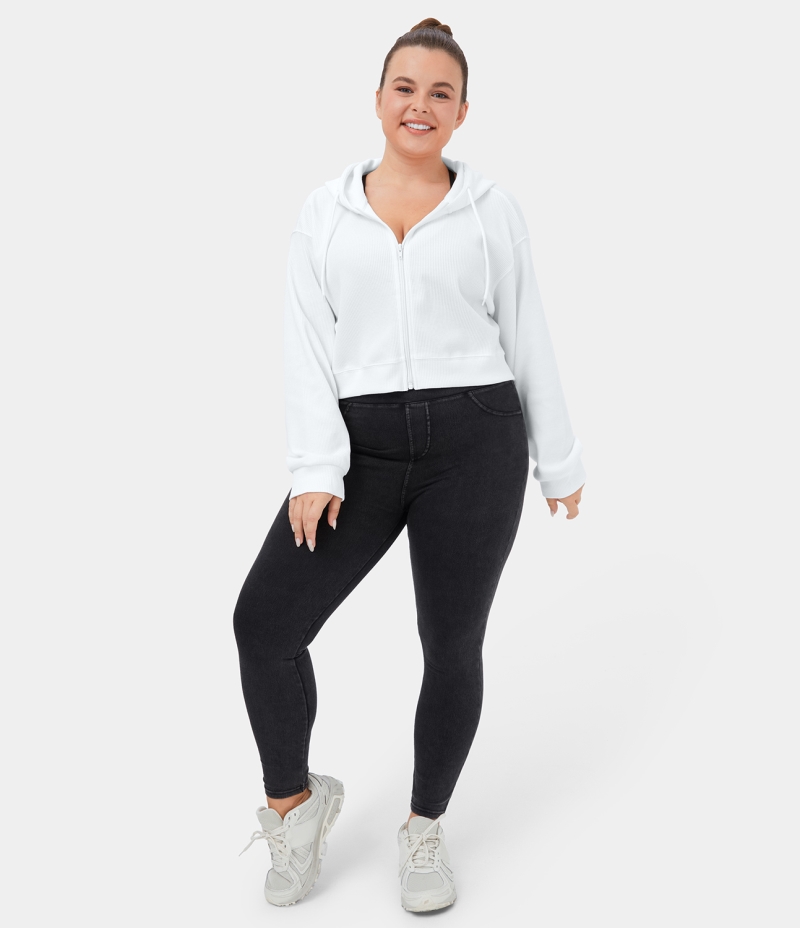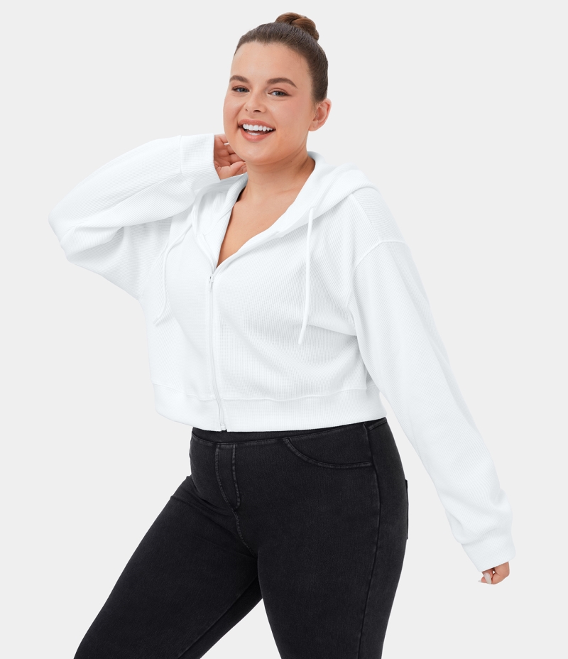 Halara Waffle Hooded Drawstring Zipper Plus Size Cropped Casual Sports Sweatshirt Women's Tops White | DUZLSKH-71