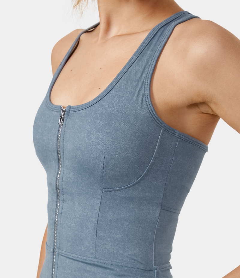 :: Halara Zip Front Racerback 2-in-1 Stretchy Denim Print Tennis Women's Dress Denim Dark Blue | 506947-OJF