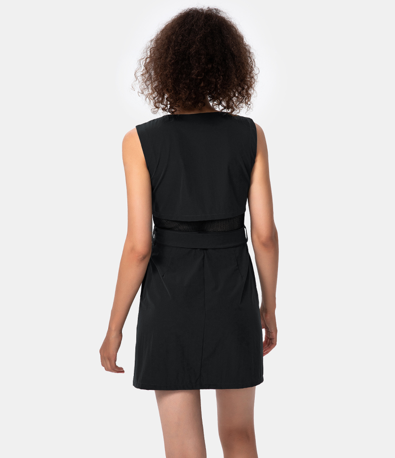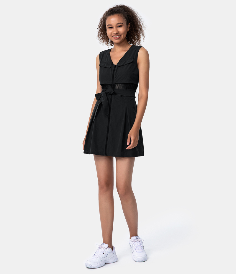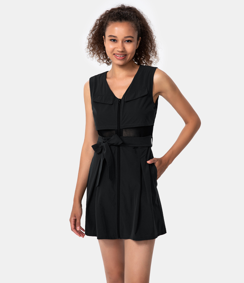 :: Halara Zipper Contrast Mesh Belted Side Pocket Sports Women's Dress Black | 128947-CQS