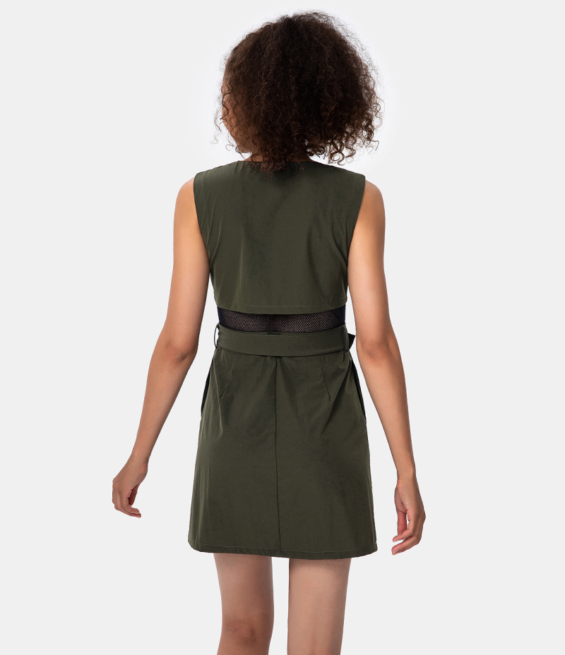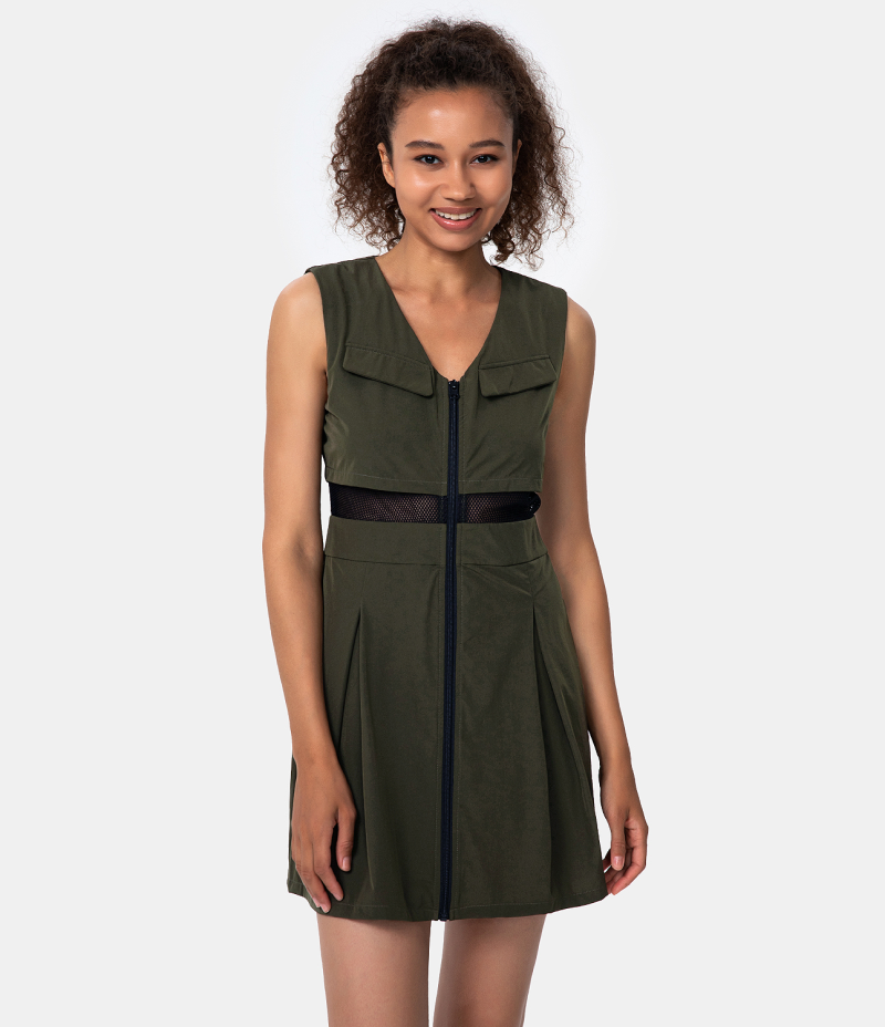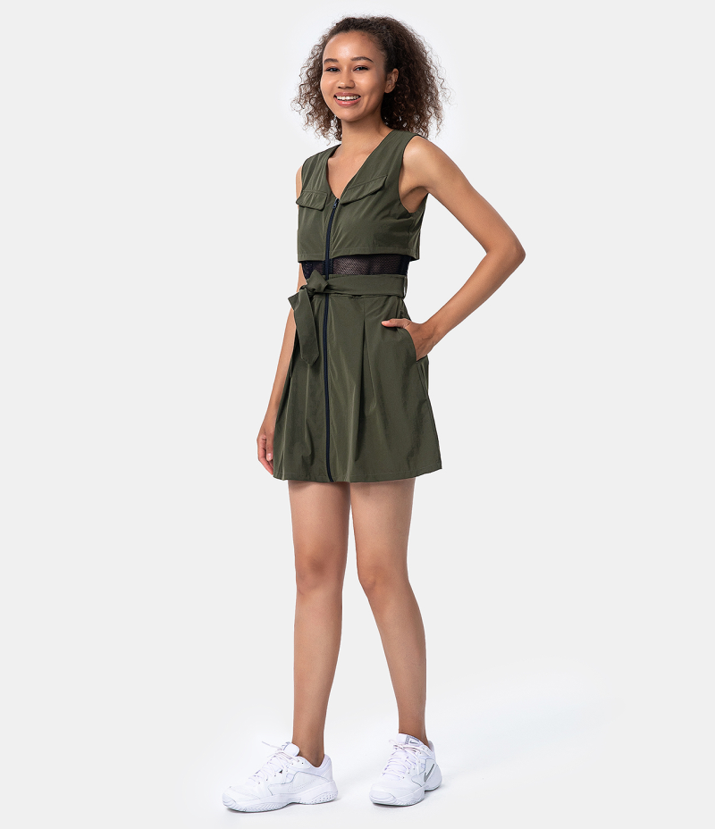 :: Halara Zipper Contrast Mesh Belted Side Pocket Sports Women's Dress Grey Green | 281376-POL